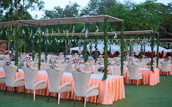 Lawn: To host an extended guest list, our breathtaking lawn provides the most picture-perfect space. With its expansive 7,000 sq ft. area, it's perfect for an intimate outdoor wedding. This venue provides a breathtaking outdoor setting for a charming night. Surrounded by beautiful, picturesque views, this venue has the capacity to host:
